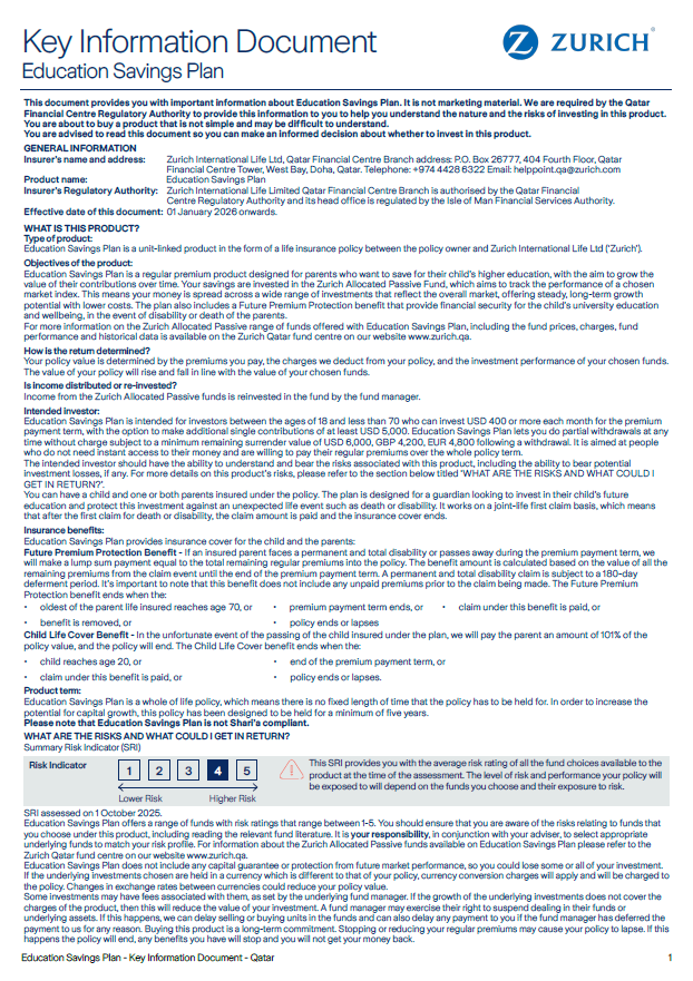 This plan is designed for parents who want to secure their child's higher education and help make their dreams possible. A dedicated Zurich Advisor will work with you to set a personalised education goal, considering your child's age, the degree they plan to study, and the preferred country of study. With a carefully selected range of funds, you can save and invest regularly to achieve your child's education payout goal.
